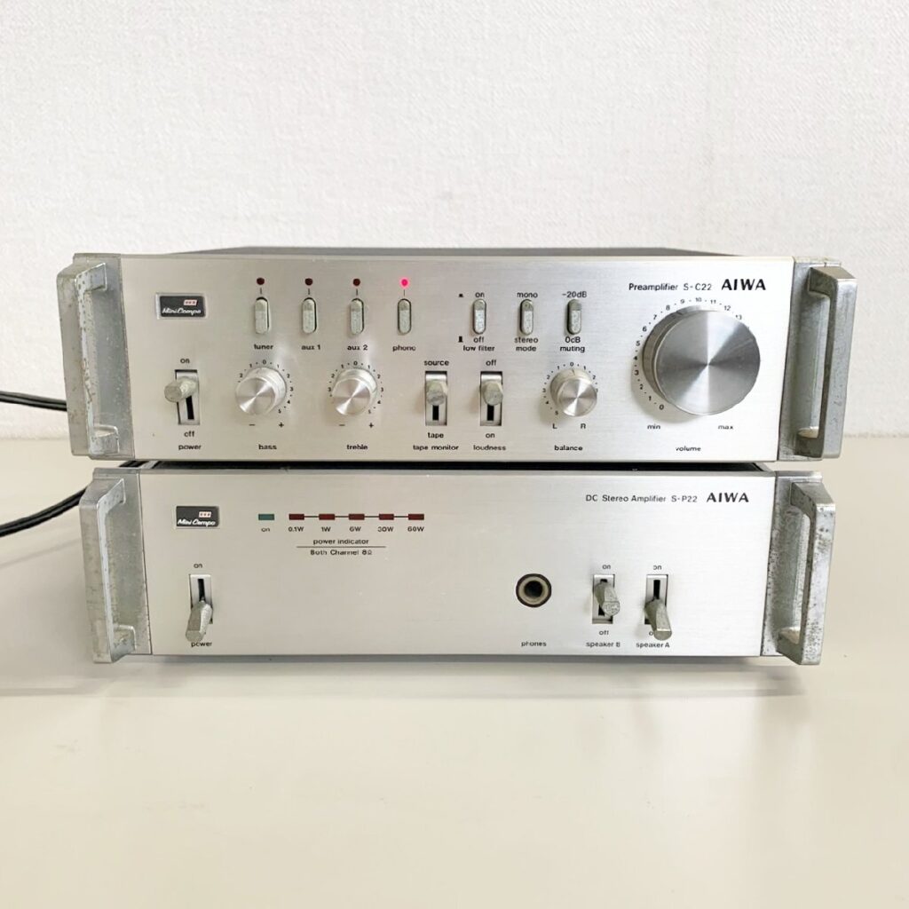 プリアンプ S-C22:幅24cm 高さ7.1cm 奥行19.95cm(ハンドル付き):重量1.5kg、パワーアンプ S-P22:幅24cm 高さ7.23cm 奥行22.36cm(ハンドル付き):重量3.8kg、傷や汚れがございました。店舗機器を使用しての簡易動作確認済でお買い取りをさせていただきました。